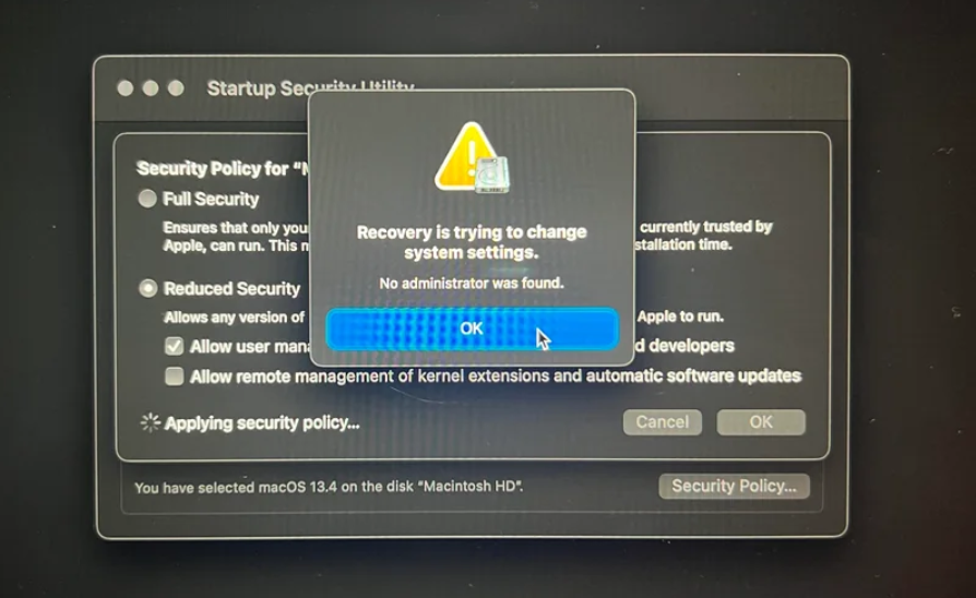 Following the software instructions, the user tried to enable system extensions, which are required for NTFS drivers to work properly. However, during this process, macOS showed an error message saying that Recovery was trying to change system settings related to Startup Security. This message usually appears on newer Macs when the system blocks changes for security reasons.