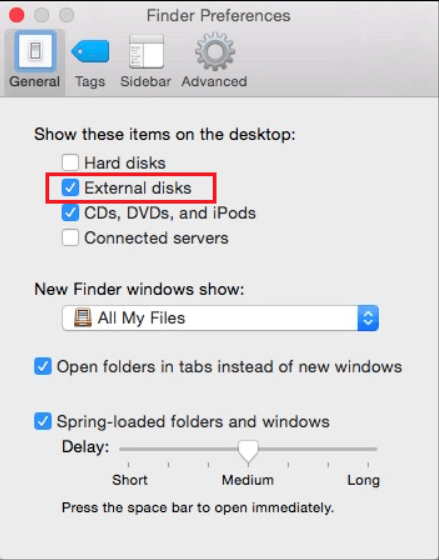 Step 2. When the Finder Preferences show up, click on the General tab. Under the "Show these items on the desktop" section, if the External disks option is unchecked, click the box.