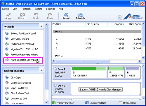 AOMEI Partition Assistant is a powerful partition magic for creating a bootable CD, DVD, USB. This wizard allows you to boot up your PC without system to manage and repair your disk, as well as to create a portable Windows system CD.