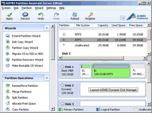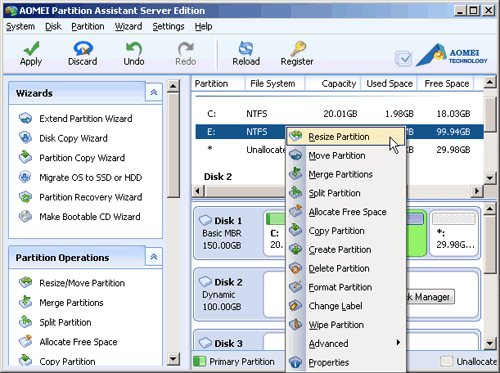 Question: I have a desktop computer that is used primarily for storing and backing up shared files. It is running Windows 2000 server. When setting up, I created 2 partitions: 20 GB (system) and 100 GB (Data), and 30GB unallocated space. I now need to resize partition on Windows 2000 server so that I could increase my system partition, but its built-in Disk Management is unable to extend volume. Does anyone have any other suggestions?
