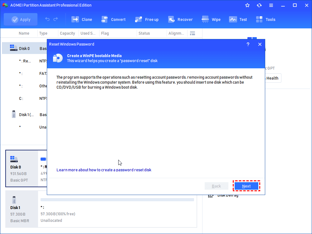 When you don't have a password reset disk created before, an alternative solution involves using a recovery boot password reset disk to reset your password. Here we recommend you use AOMEI Partition Assistant Professional, a powerful password reset software designed to simplify the password reset process.