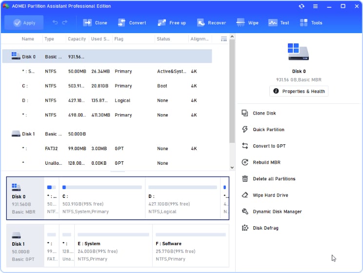 As an all-in-one disk and partition manager, AOMEI Partition Assistant is not only an MBR to GPT conversion tool, but also a complete disk and partition cloning, resizing, recovery, and application moving solution.