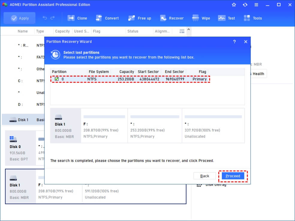 You can preview the lost partitions before restoring. Choose the ones and click Proceed. Then lost partition and data will be back.