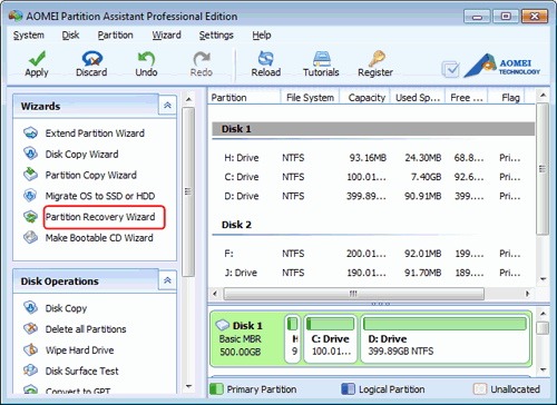 - Launch Partition Assistant. Click the target partition. Then move on to the top toolbar. Select "Recover" > "Partition Recovery".
