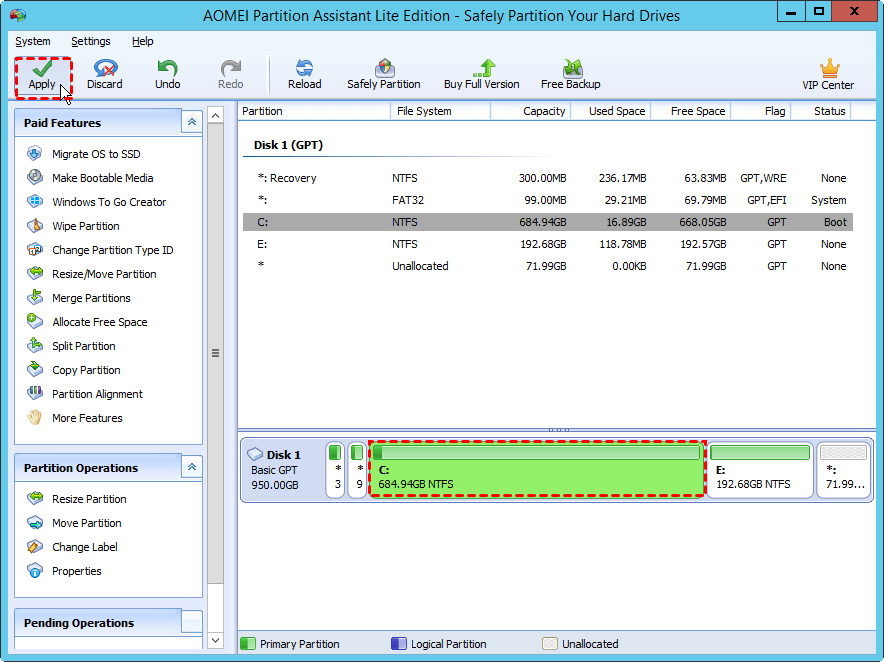 Step 3. Back to the main interface, click “Apply” at the toolbar to submit all the operations.