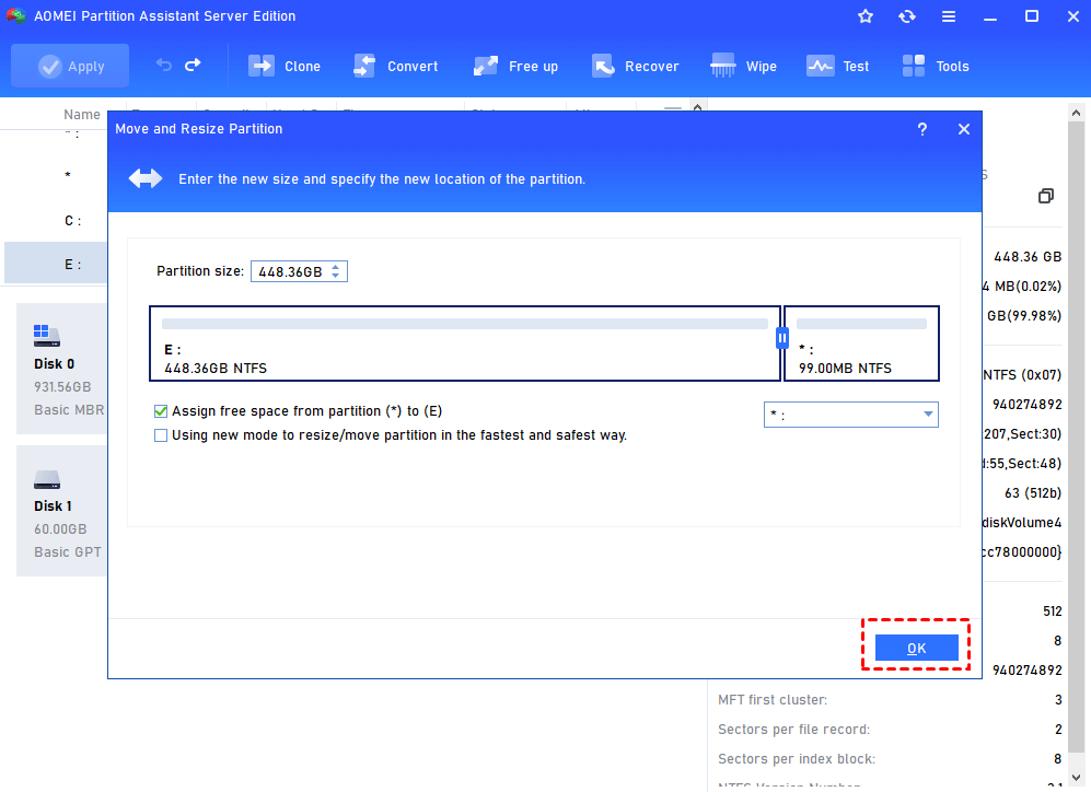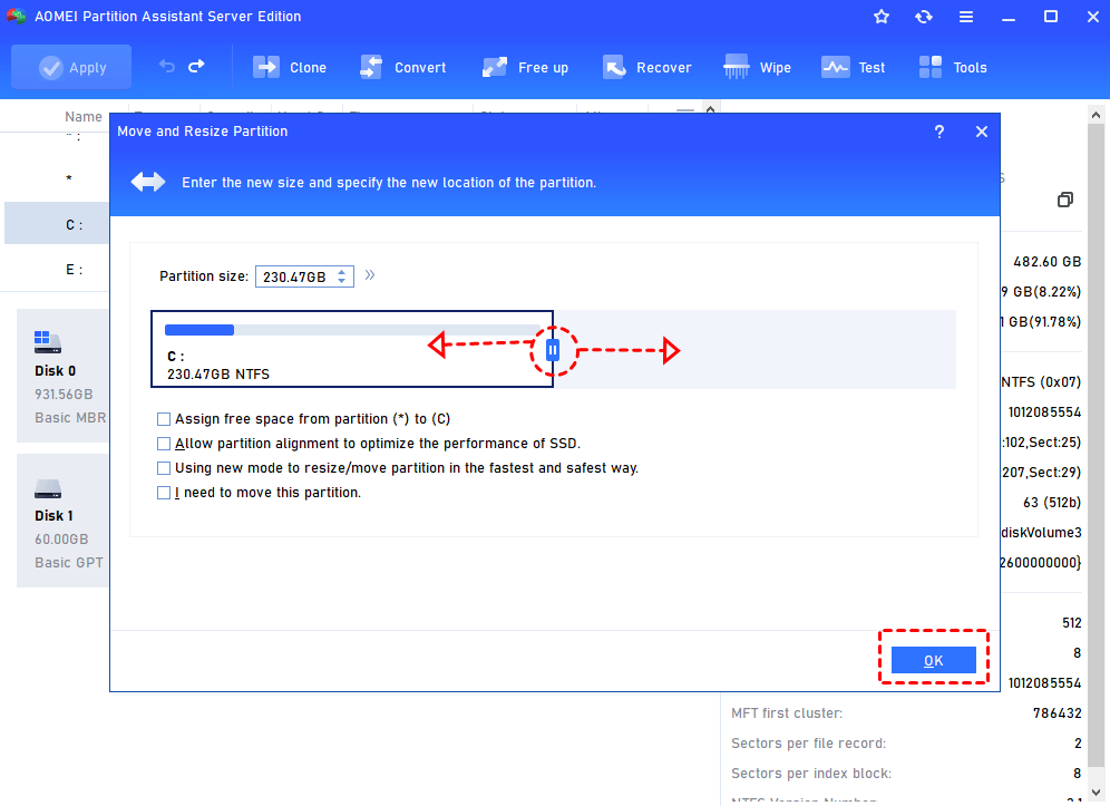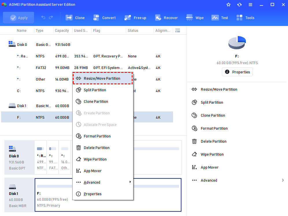 Resize Partition is one of the basic features that AOMEI Partition Assistant provides. It helps you to adjust partition size on your Server hard drive.