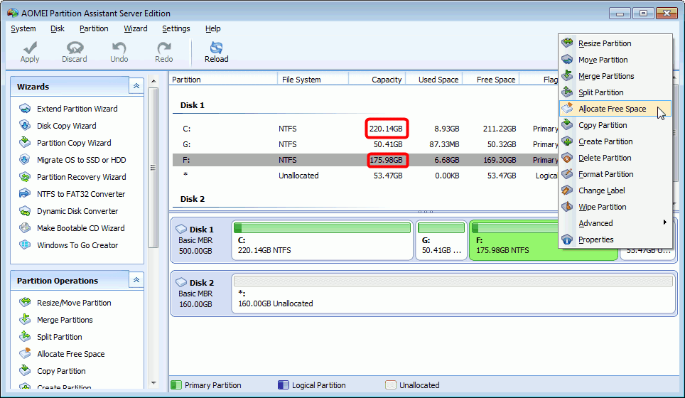 Using Windows native Disk Management to extend system drive will require that you delete another partition when there is not adjacent unallocated space. That makes the whole process become more complicated and time-consuming. Luckily, there is a workaround: applying a third-party partition management software such as AOMEI Partition Assistant Server. To extend system drive in Windows SBS 2011, its “Merge Partitions” and “Allocate Free Space” features are highly recommended.