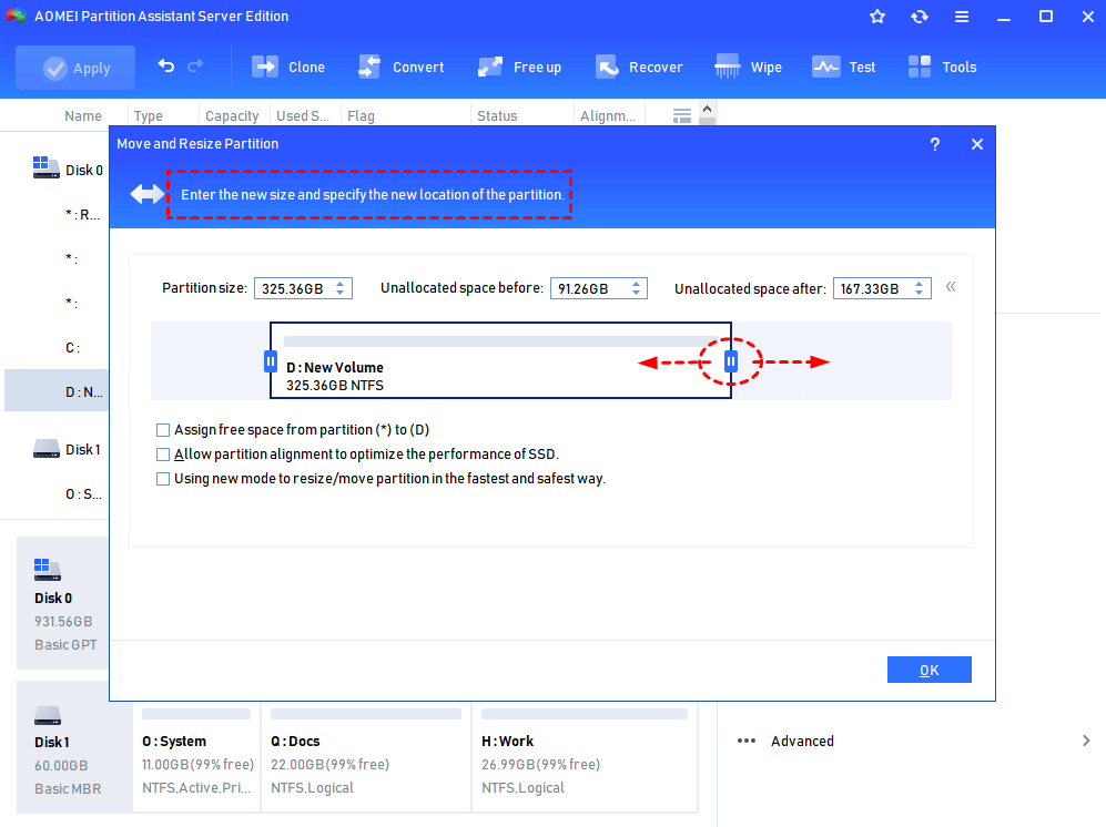 If you cannot reduce D drive to extend C drive in Server Disk Management due to its limitation, and don’t want to delete D drive directly, you can switch to a third-party Server partition manager like AOMEI Partition Assistant Server. Much better than Disk Management, this software can allow you to:
