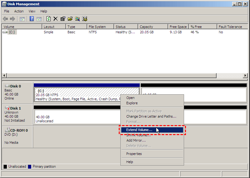 For most users, the Server Disk Management should be the prior choice when they encounter some disk partition problem. However, to extend a partition via this Windows built-in tool, there must be an adjacent unallocated space behind the (system) partition you wish to extend. Otherwise, the “Extend Volume” option will be not clickable. If your disk partition layout meets the requirement, you can follow the steps to enlarge system partition in Windows SBS 2011.