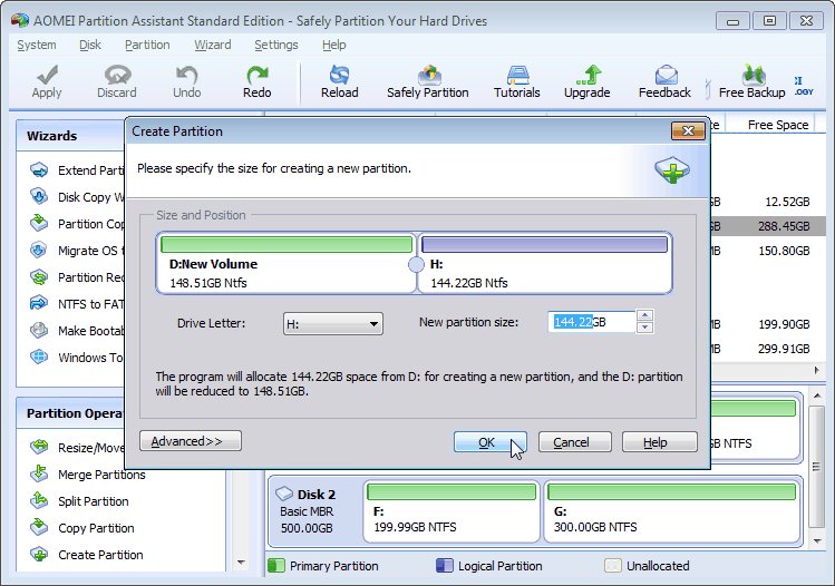 Then a new smaller windows pops up. In this new window shows the information about the new partition that is going to come into being. Drag the slider bar to make changes as you like. Then click OK.