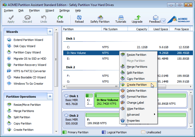 In short, both ways of creating new partition are not difficult. The difference is: the later method can support to create any FAT32 partition more than 2TB in size, but the former one supports up to 32GB only. Besides, Partition Assistant has more features to manage disk partition, such as resize partition, repartition, etc. It can work on Windows XP/2000/Visat/Windows 7/Windows 8 and Server 2003/2008. The free edition supports 32 bit and 64-bit non-server windows systems. Click here to download the Free Partition Manager.