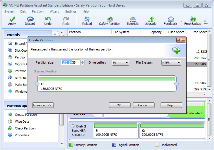 The Partition Size:The wizard will display the minimum and maximum size for your choice, and you could specify a proper size for new partition.