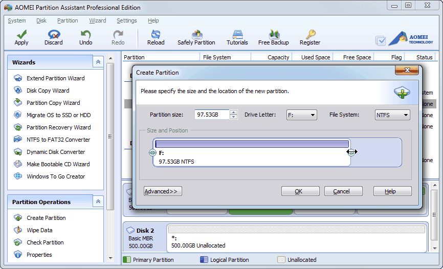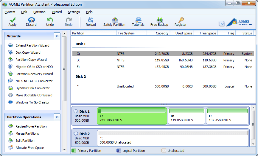 AOMEI Partition Assistant Professional (PA Pro) is a powerful solution to allow you experience with all features such as resize/move partition, merge partitions, split partitions, allocate free space, clone disk, copy partition, dynamic disk management and so on. It can work wonderfully on hardware RAID and Windows 7/8/2000/XP/Vista operating systems (Both 32bit and 64bit). Your all data on the disk can be completely protected when all operations is being processed. This utility can repartition a hard drive easily to help junior users to manage their disk.