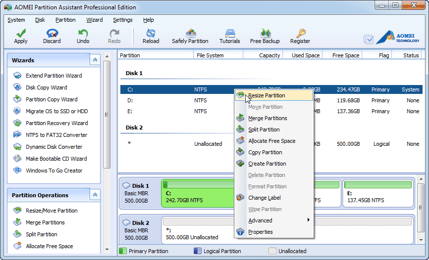 Under these situations, the majority of people will choose Disk Management to solve problems which they may come cross. But unfortunately, the built-in tool in Windows can’t do repartition. Actually, we can repartition a hard drive into desired sizes on the basis of data security and without re-installing Operating System, but this may need to use 3rd party tool - AOMEI Partition Assistant, the professional Windows partition manager to repartition a hard drive.
