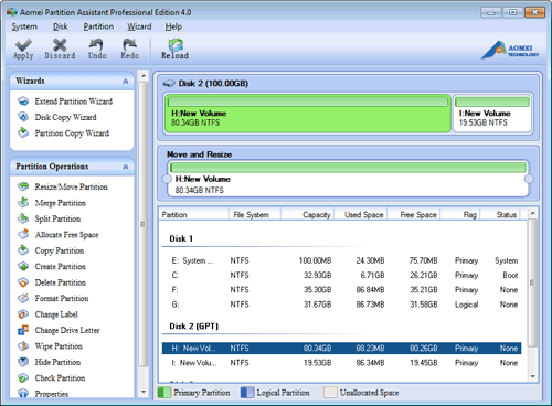 The newest AOMEI Partition Assistant is the best partition manager software to easily resize GPT disk partition for Windows /Vista/XP and Server 2000/2003/2008 32 & 64 bit.