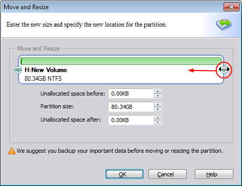 Step3.In the new pop out window, drag the boundary (Both sides) rightwards or leftwards. (P.S. For the better data protection or saving time, we do not recommend you to drag the system partition left boundary rightwards)