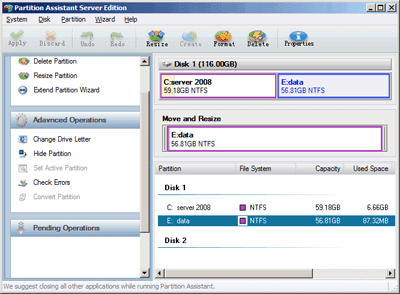 As a Server 2008 user, I always think resize partition on windows server 2008 is not an easy task. Because some unreliable software might destroy all the data during the process when resize partition on Windows Server 2008. Now, I have found a fantastic solution – Partition Assistant Server Edition. This professional server partition manager performed all the advanced functions well. It helps me freely resizes Server 2008 with data untouched, even the BitLocker encrypted partition. Aside from resizing function, it also can create, delete, merge, and split partitions, etc.