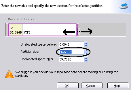 2. Resize partition as you wish, Specify partition size or drag the double-line bar leftward or rightward, then click Ok: