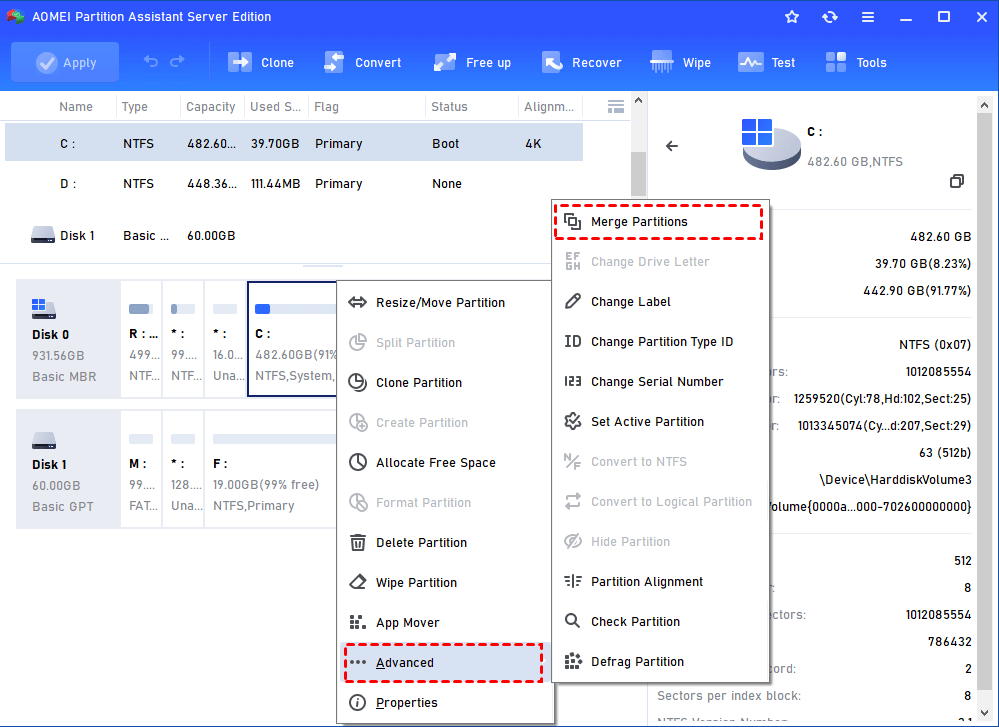 Step 1. Install and launch AOMEI Partition Assistant Server edition in Serer 2008. Right-click the partition you need to merge and choose Advanced > Merge Partitions.