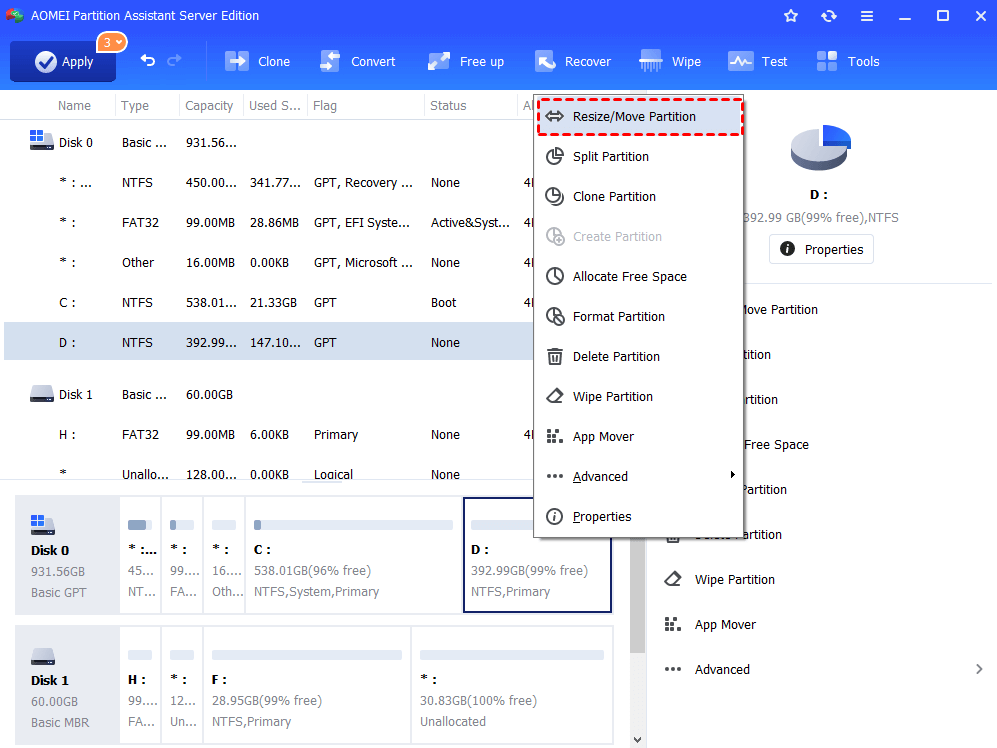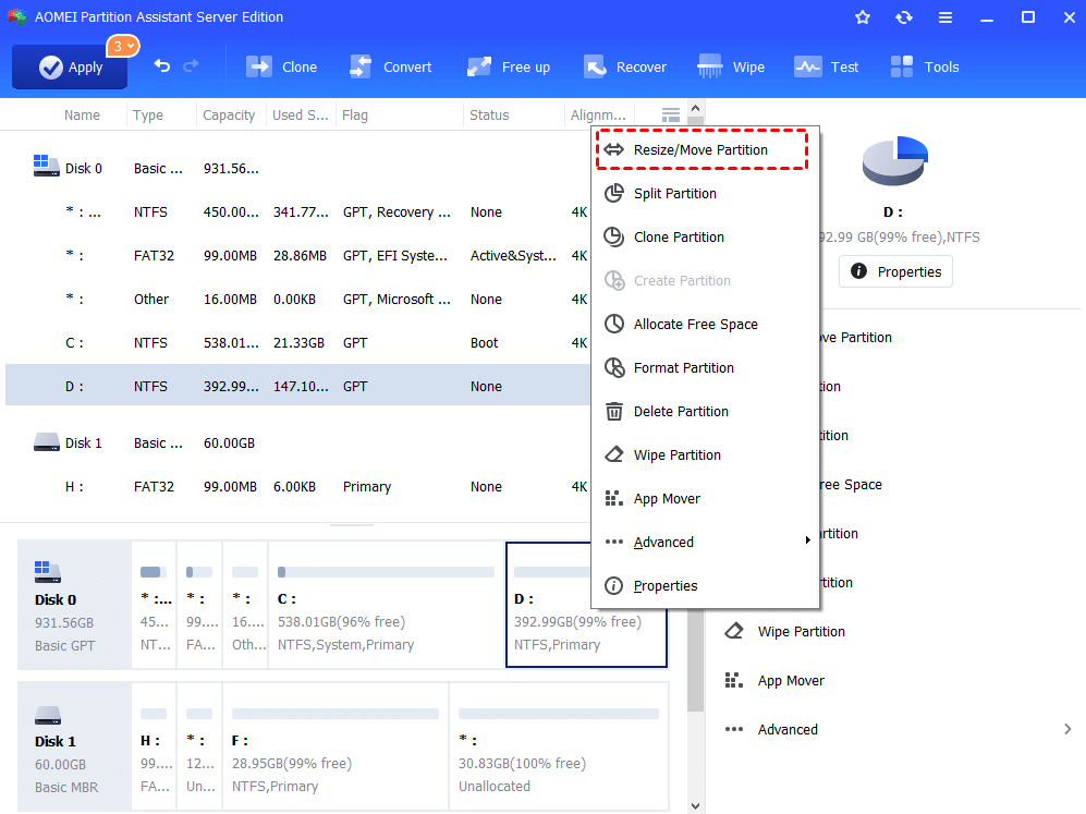 Step 1. Then right click D partition and select “Resize/Move Partition”.