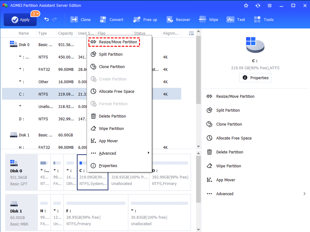 In one word, when “Extend Volume” greyed out or disable in Windows Server 2008, you can refer to this article to solve it easily. If you want to deal with it safely, AOMEI Partition Assistant Server is much more recommended. Besides helping you easily extend another partition, it also offers many other features to help you manage your disk partition: clone partition/disk, transfer OS to new hard drive (SSD or HDD), split partition, quick partition, etc. In addition in Server 2008, in Server 2025/2022/2019/2016/2012/2025 and all PCs, it is useful for managing disk partitions with the most ease and security.