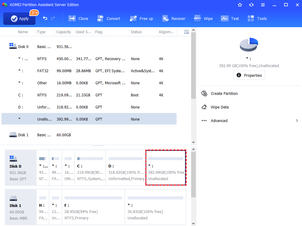 That's why many users find there is adjacent free space next to the volume they plan to extend, but the "Extend Volume" feature still greyed out. In this case, we need to delete all logical volumes inside the extended partition and the extended partition itself. Then get adjacent unallocated space (not free space) and extend another partition in Disk Management. Luckily, in the AOMEI Partition Assistant Server software, both different types of space are marked as "unallocated space", and can be used to extend primary or logical drive without restrictions.