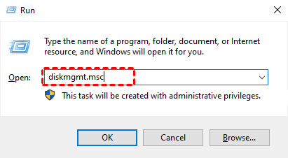Press Windows + R at the same time. Then, type diskmgmt.msc and press Enter key. It will show you the Disk Management window.