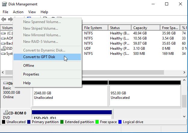 After a short wait, the disk will be converted to GPT (or vice versa), and you will then be able to repartition the hard drive. However, you cannot use Disk Management to convert an MBR boot disk to GPT since you can’t delete the boot partition via Windows Disk Management. As a workaround, you can boot your server from a Windows Server installation disc and press Shift +F10 in the Windows Setup screen to open the DiskPart utility. In DiskPart you should enter the below commands in the command prompt to convert the disk to GPT: