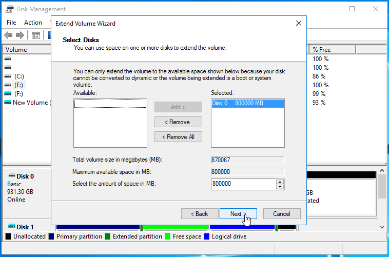 2. In the Extend Volume Wizard window, select the unallocated space and click “Next”.