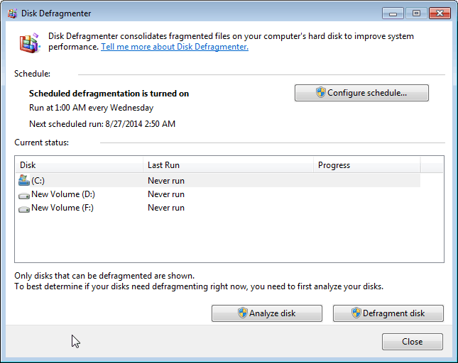 3, In Disk Defragmenter, when scheduled defragmentation is available, click on the button of Configure Schedule and then turn off the schedule and click OK.