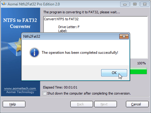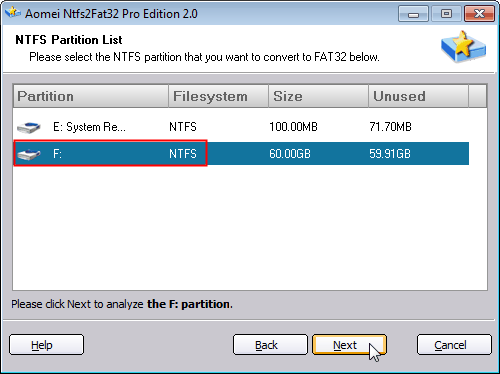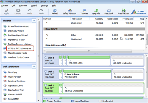 Good news is that we got the best and reliable way of converting NTFS to FAT32. Free AOMEI Partition Assistant Standard with NTFS to FAT32 Converter, which allows you to convert NTFS to FAT32 with no partition size limitation, and no data loss. This software supports Windows 10, 8, 7, XP, and Windows Vista, so feel free to use it. It has user-friendly interface and easy to use. Download and have a try.