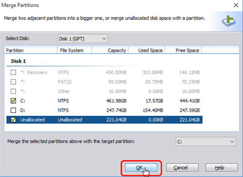 Step 3: In the small pop-up window, check both the unallocated space and C drive and then click “OK”.