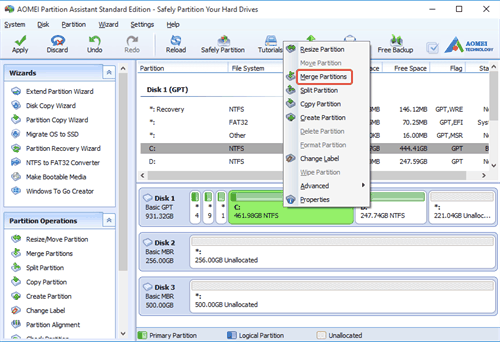 Step 2: As you can see from the screenshot, an unallocated space has been created. Right click system drive C now and select “Merge Partitions”.