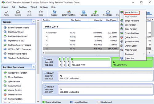 Here is an illustration: Release some free space from data partition and then add it to system drive. To begin with, free download AOMEI Partition Assistant Standard Edition.