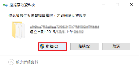 如果彈出的資訊明顯提示您需要管理員權限才能刪除此資料夾,請參考以下步驟。