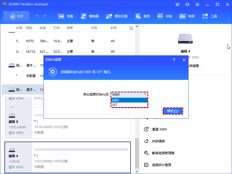 3. 在彈出的視窗中選擇將磁碟初始化為MBR或GPT樣式。