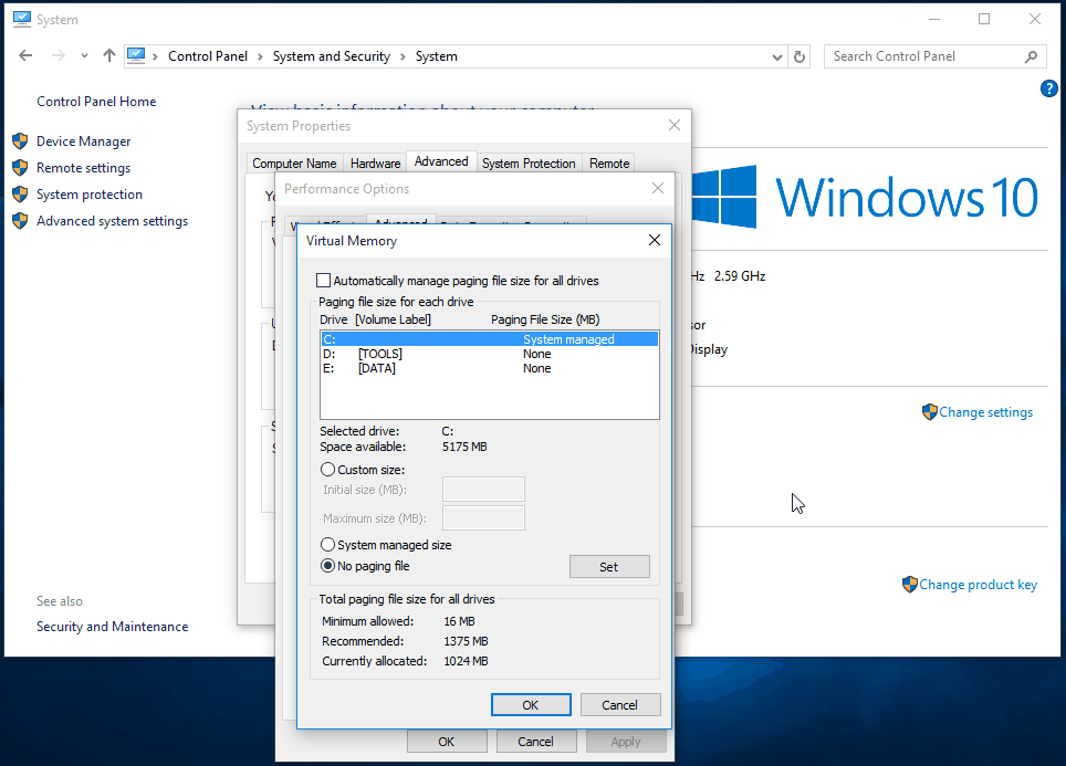 步驟5:在“控制台/系統和安全/系統/進階系統設定”下的效能/進階/更改中停用分頁檔案,並在檔案總管中刪除c:\pagefile.sys檔案。