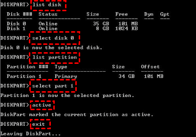 • active(正確的訊息應該是:DiskPart 將當前分割區標記為激活)