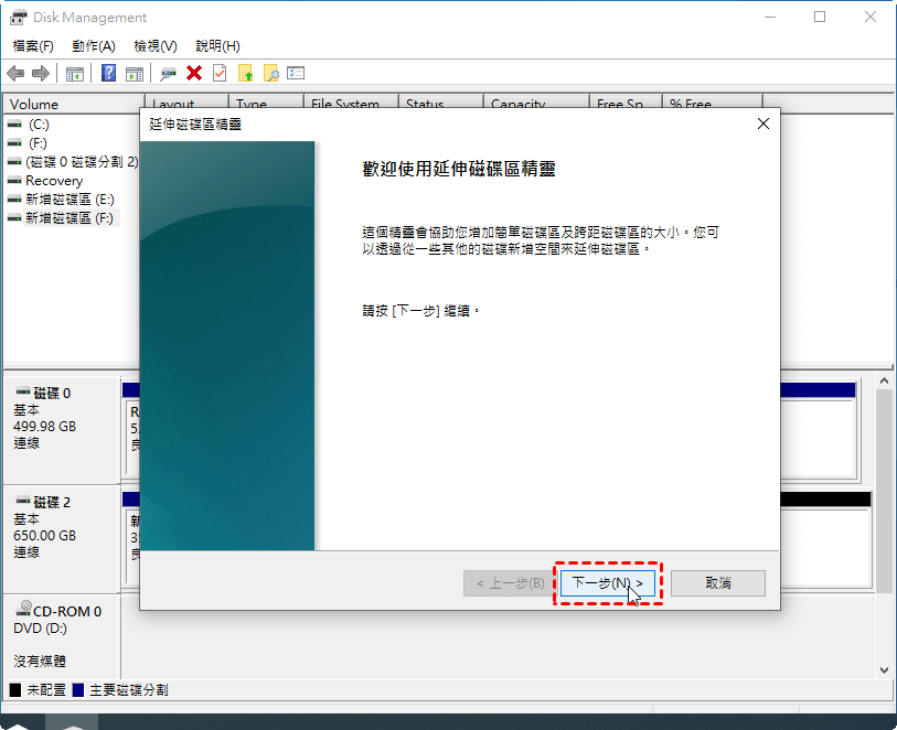 3. 在延伸磁碟區精靈窗口,請點選“下一步”。接著選擇磁碟與要擴充的分割區大小。