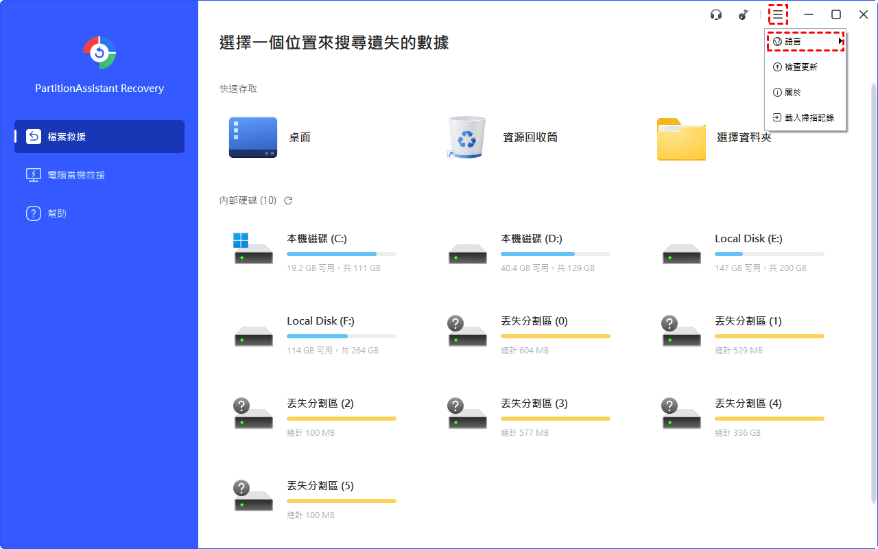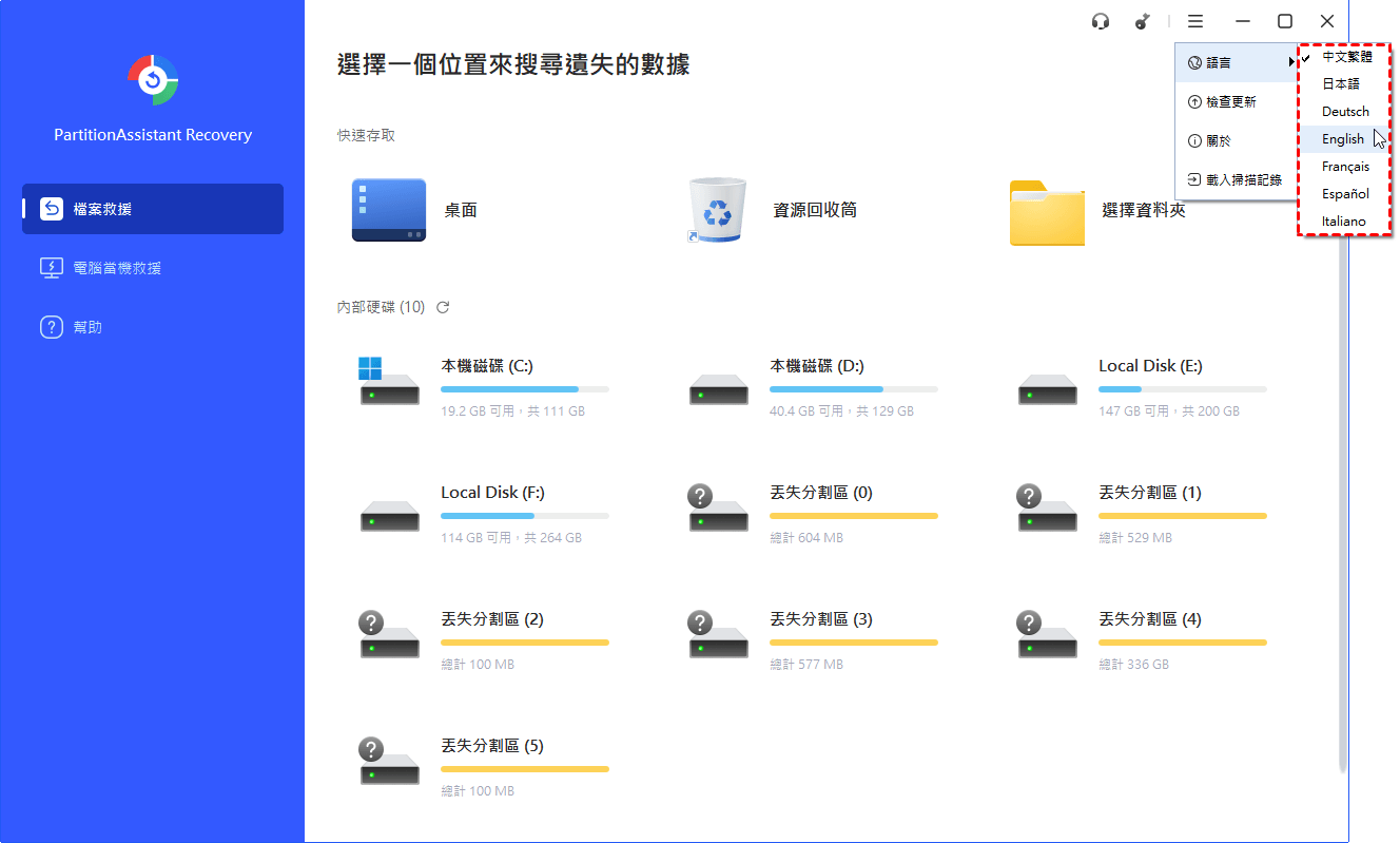 目前,PartitionAssistant Recovery 支援多種語言,包括英語、德語、法語、日語、西班牙語、義大利語和繁體中文。您可以自行切換語言。以下是切換語言的步驟。