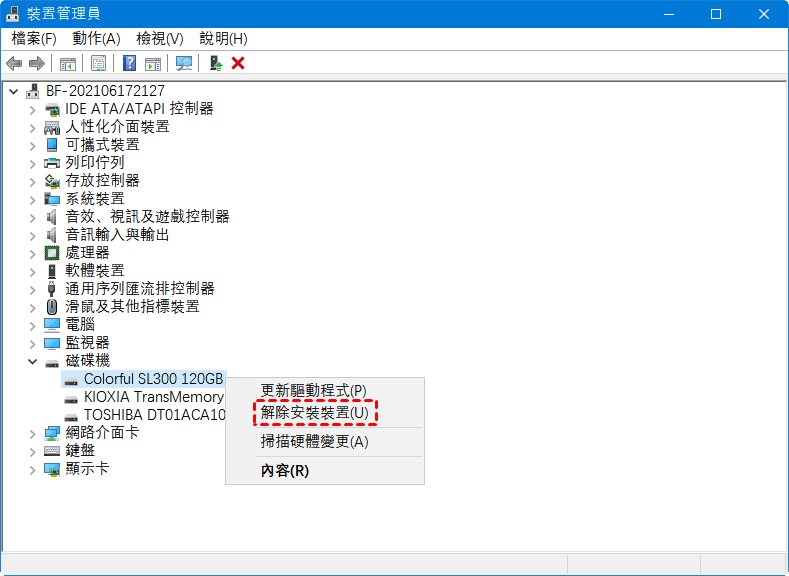 2、展開“磁碟機” >> 右鍵點選USB隨身碟 >> 選擇“解除安裝裝置”。