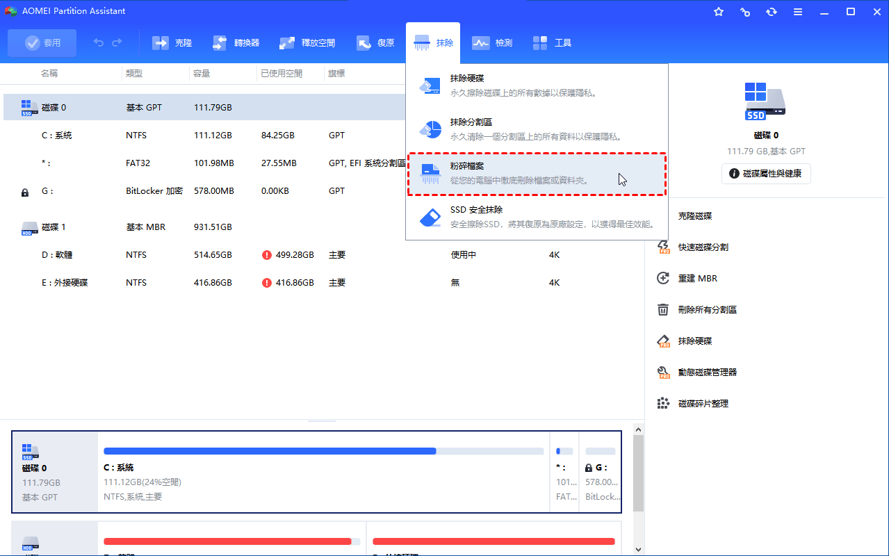 若發現 PDF 檔案刪不掉,可以使用專業工具(例如 AOMEI Partition Assistant)直接粉碎檔案,以達到強制刪除的目的。