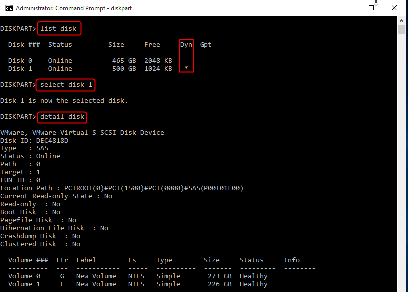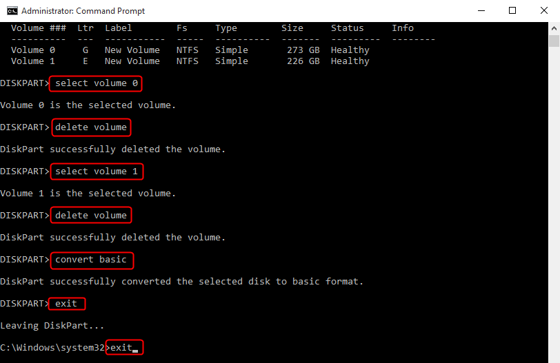 3. 在命令提示符下,重複上述方法中的步驟 2 —步驟 3,將動態磁碟轉換為基本磁碟。