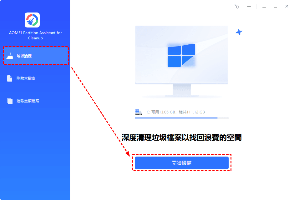 步驟1. 安裝並啟動 AOMEI Partition Assistant for Cleanup,從左側依次點選「垃圾清理」>「開始掃描」。