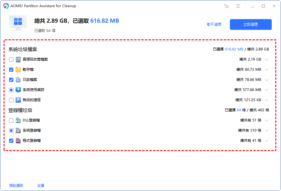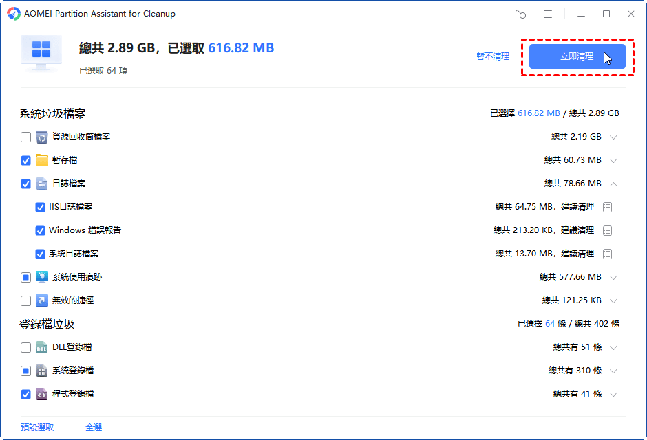 步驟3. 掃描完成後,請根據需求選取想要清理的選項,然後點擊「立即清理」開始清理。
