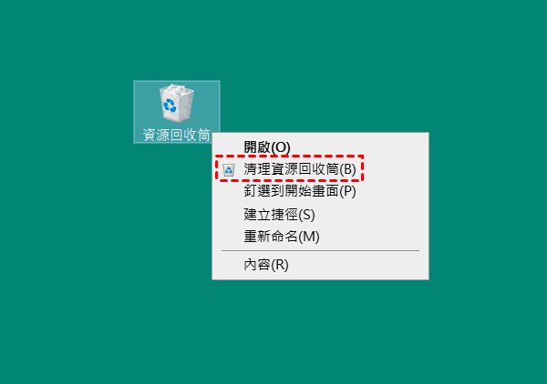 ◼ 清理資源回收筒:從桌面上右鍵點選資源回收筒,選擇“清理資源回收筒”。