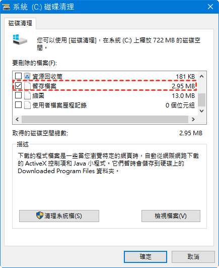 3、請勾選想要清理的檔案類型,例如暫存檔案、下載的程式檔案、資源回收筒等。