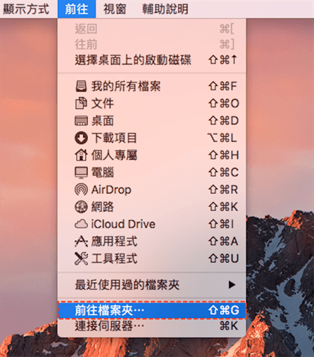 打開 Finder,點擊“前往”>“前往檔案夾”。