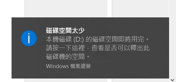 Windows、macOS、Linux等系統的電腦都可能在長期使用後出現儲存空間不足的問題。例如,在 Windows 電腦中,您可能會收到來自系統的提示:磁碟空間太少。