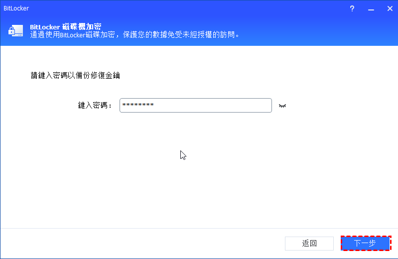 2.請輸入您設定的密碼以進行備份。請輸入正確的密碼,然後點擊“下一步”按鈕。